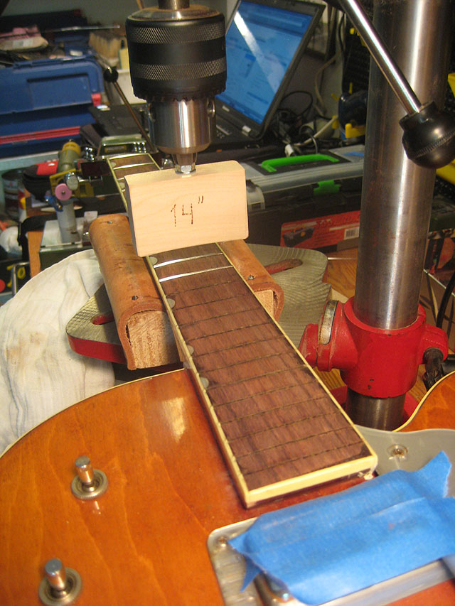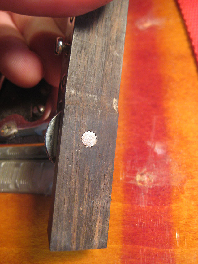 Jeg bruger en kombination af hammer og presse til at sætte båndene i. Desuden bruger jeg på denne her guitar også varm hudelim til at binde båndene bedre til gribebrædtet. Træet var ret blødt, sikkert pga. alt det gamle fingersnadsk der har siddet under båndene i årevis. Derfor vil det give en bedre kontakt imellem bånd og gribebrædt med den krystalhårde hudelim. Jeg tror ikke at limen i sig selv holder båndene fast, men limen udfylder de små hulrum der måtte opstå imellem træ og metal. Min erfaring siger mig også at det giver en meget bedre tone når båndene er limet fast.